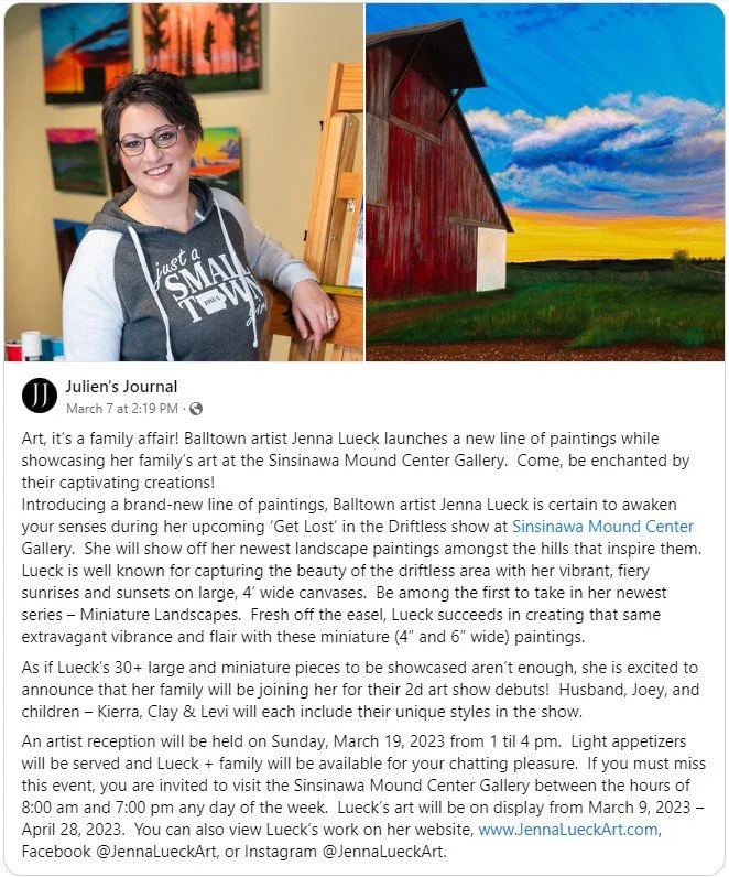 “Artist Jenna Lueck is well-known for capturing the beauty of the driftless area with her vibrant, fiery sunrises and sunsets on large canvases. Fresh off the easel, Lueck succeeds in creating this same vibrance and flair in her new miniature original paintings.”
